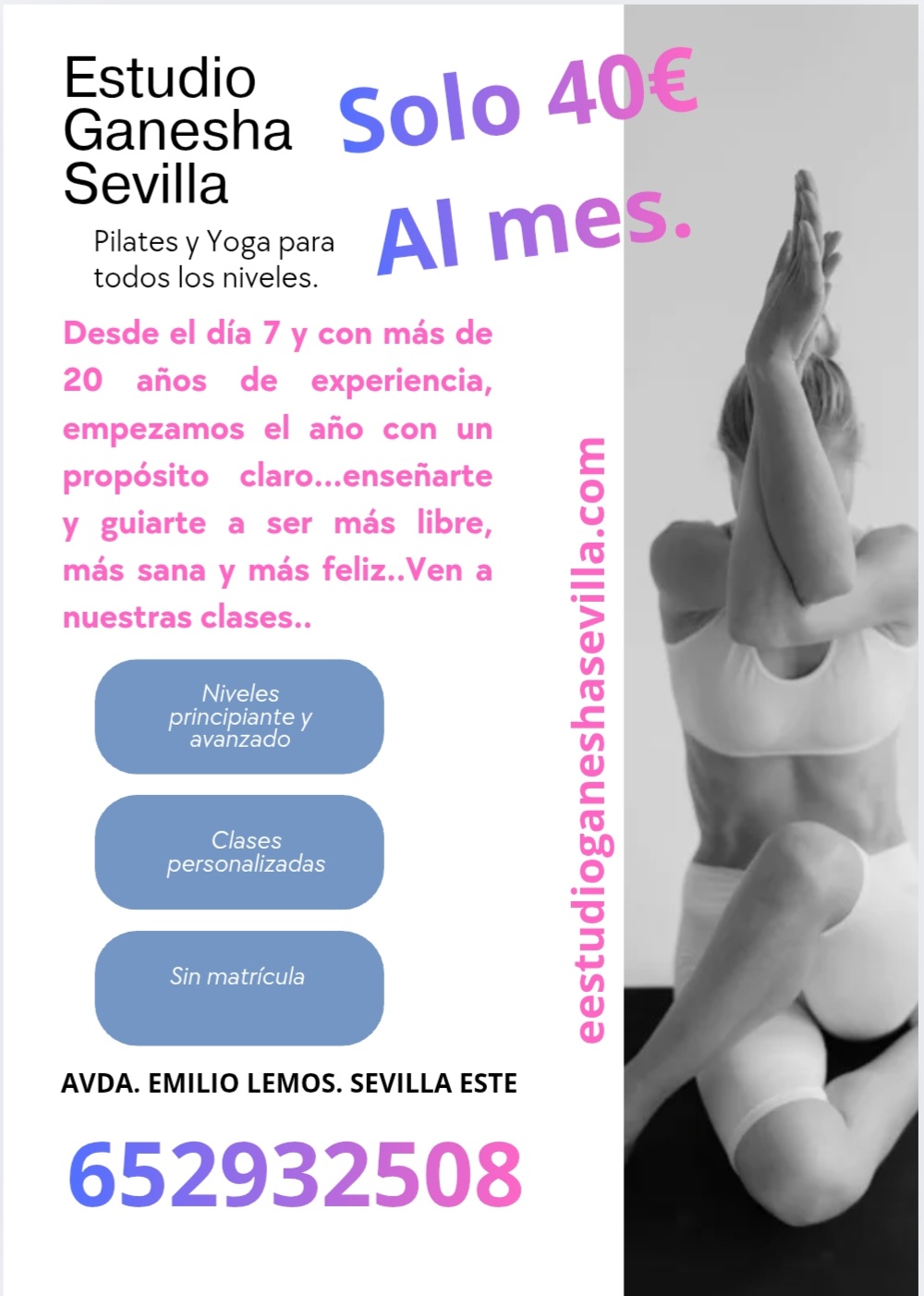 Te ofrecemos las mejores y más completas clases en Sevilla este,(puedes ver más información de Pilates y Yoga, en sus diferentes secciones, en esta pagina web), que junto con nuestros servicios de coaching y consejos de dietética y nutrición, haremos que tu vida, pase al siguiente nivel..
